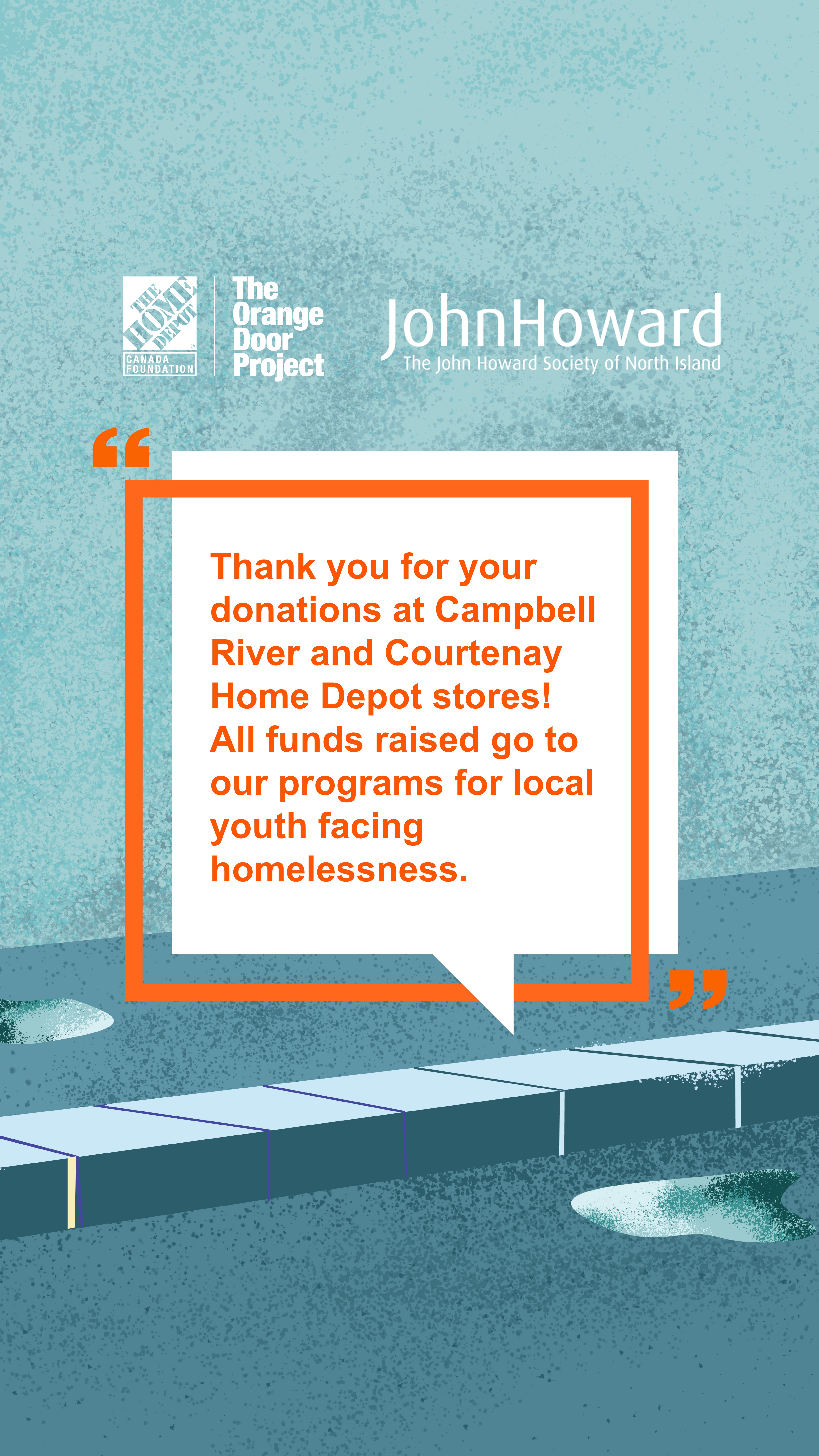 The Home Depot Canada Foundation is committed to preventing and helping to end youth homelessness. In 2024, The Home Depot Canada Foundation achieved $82 million in its commitment to raise $125 million by 2030. Together, this support works to break cycles of inequity and enable at-risk youth facing homelessness to achieve positive development outcomes and realize their full potential. The Orange Door Project campaign is The Home Depot Canada’s national customer fundraising campaign. From November 12 until December 21, 2025, The Home Depot Canada customers can make a donation in-store or online (http://www.canadahelps.org/en/dn/28220) in support of a local youth-focused housing charity. If donating online, please select “BC, Campbell River” or “BC, Courtenay” under “Fund”. Thank you!